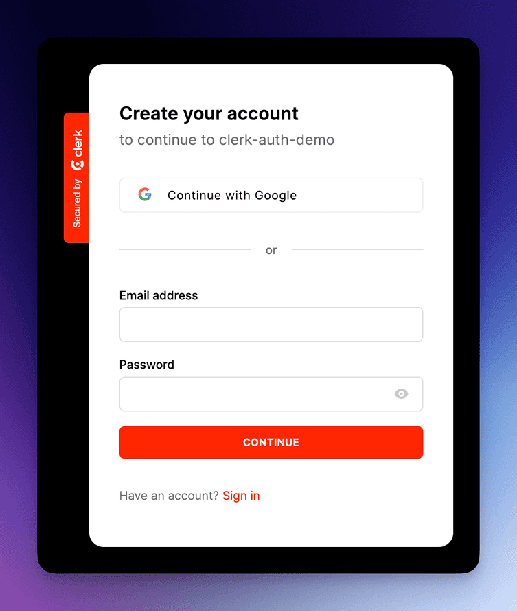 }If you now go to http://localhost:3000/sign-in you’ll see this premade Sign Up component that works with both Email & Password and whichever social auth providers you selected.